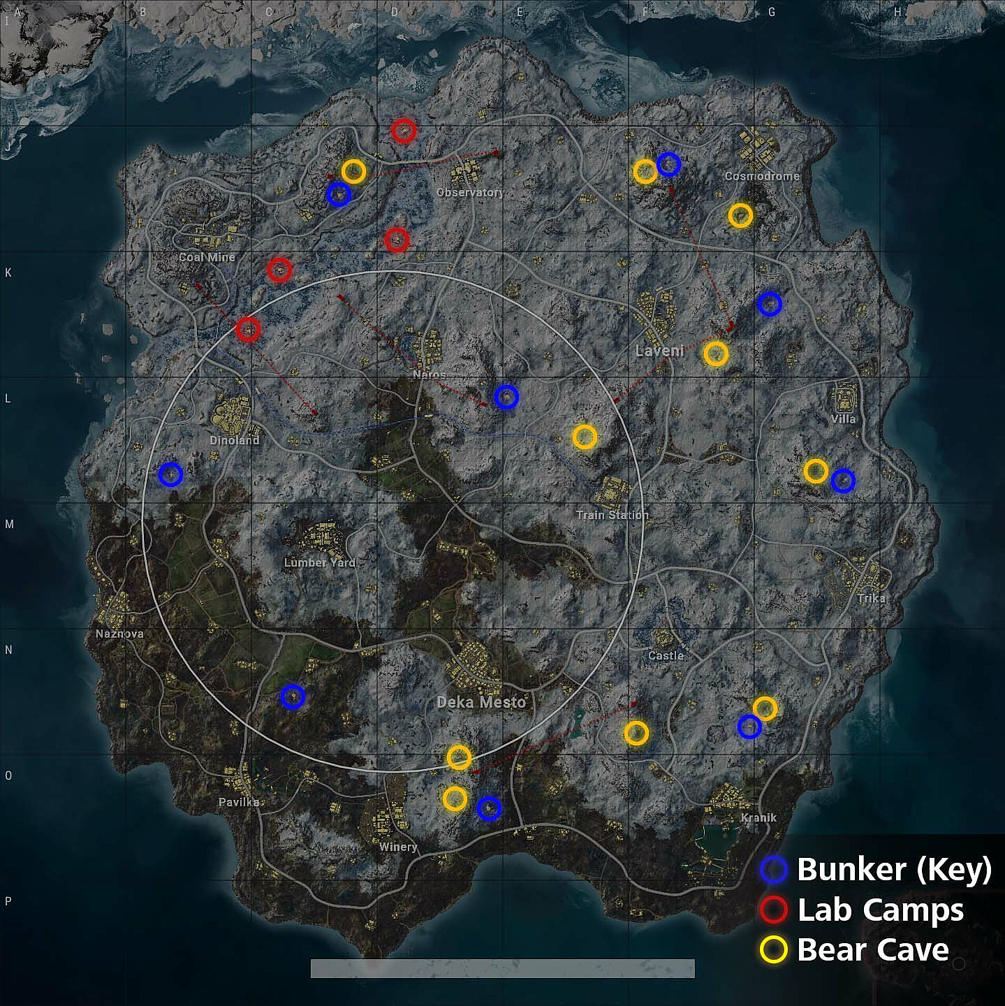 - Study the community map to memorize Bear Cave, Lab Camp, and Secret Bunker locations relative to common drop zones