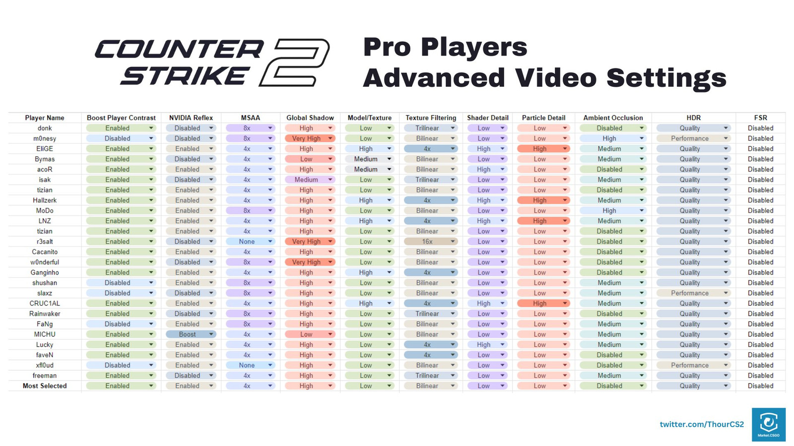 CS2 data analyst and enthusiast Thour conducted extensive research compiling the most commonly utilized video configurations across 25 elite professional competitors. His methodology involved analyzing gameplay streams, tournament footage, and direct player interviews to establish the definitive competitive settings profile for 2024. The comprehensive findings were published on social media platform X.