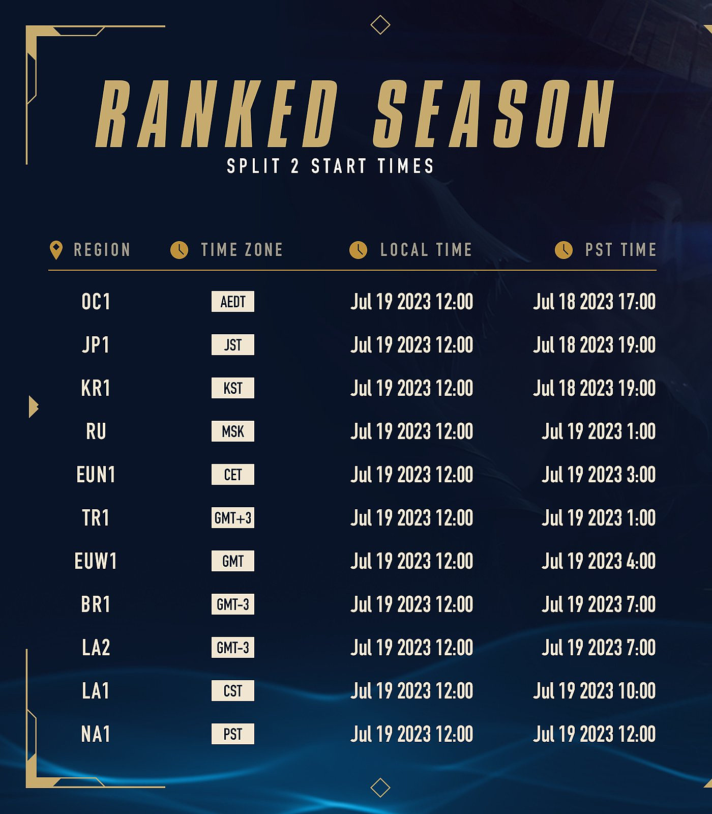 The competitive reset for the 2023 ranked season commences on July 19th through 20th, with specific activation times varying by geographic location. All participants will undergo a fresh calibration process, playing through placement matches to establish their initial standing in the new split. Below you’ll find the complete regional deployment schedule: