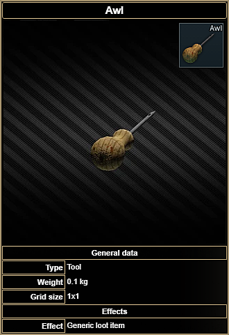 As a general-purpose crafting component, awls appear across standard world barter locations where fabric, sewing implements, and basic tools typically generate. Strategic looting should prioritize garages, workbenches, industrial storage lockers, sports bags, and hidden Jaeger stashes, as these locations maintain the highest probability for successful acquisition.