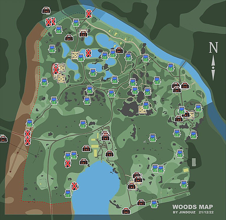 The Woods territory offers another excellent hunting ground for these culinary items. Multiple nourishment spawn points concentrate within the abandoned village settlement and the former USEC military encampment, alongside diverse loot containers scattered throughout the area. These positions receive clear marking on the provided cartographic reference below. Concentrate your inspection efforts particularly on brown-colored wooden crates, which demonstrate notably higher food spawn frequencies compared to other container varieties.