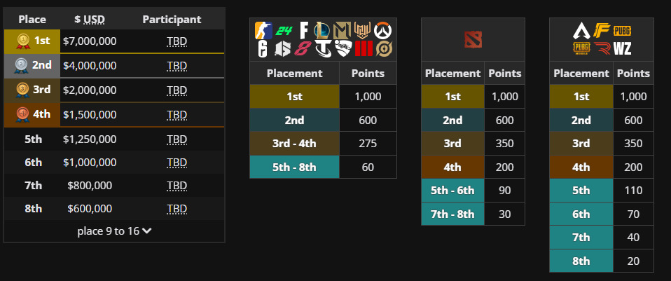 - Club Championship uses Olympic-style scoring with 1,000 points for first place across multiple esports titles