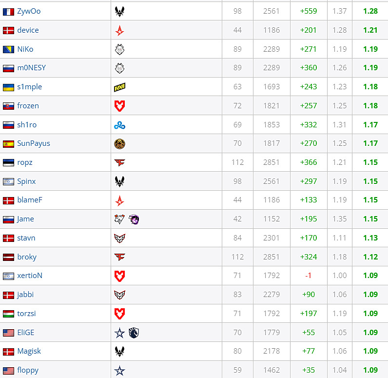 HLTV Top 20 by rating at Big Events, top-20 opponents (40 maps minimum)