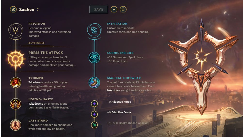 Conqueror stands as the premier keystone rune for Zaahen, perfectly complementing his sustained combat style and stack-based mechanics. However, experienced players can experiment with Fleet Footwork for safer laning phases against punishing ranged matchups. All recommended rune configurations emphasize survivability while maximizing damage output potential throughout all game phases.